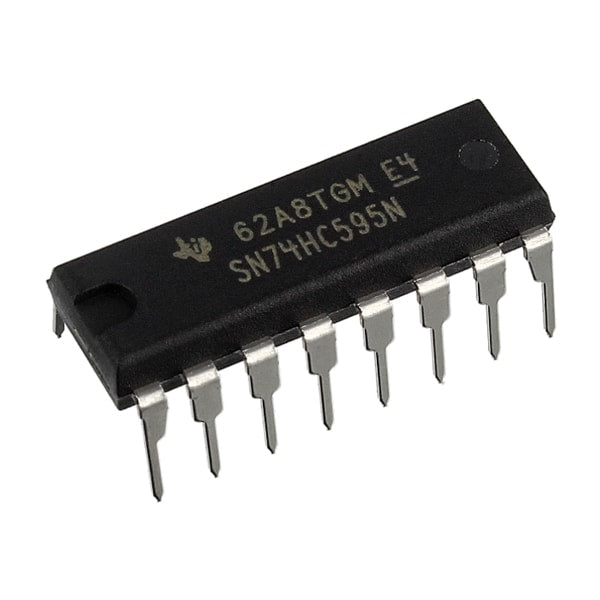 8-bit shift register 74HC595. This shift register is great for freeing up your output pins on your Arduino or other microcontroller or Raspberry Pi.