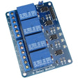 4 Channel Relay Module. Uses optocoupler driven relays to switch higher voltage and/or current applications with an Arduino, Raspberry Pi, Beaglebone, or other microcontroller or ARM boards.