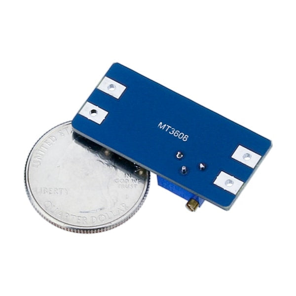 This module features the MT3608 2 Amp step up (boost) converter, which can take input voltages as low as 2V and step up the output to as high as 28V. The MT3608 features automatic shifting to pulse frequency modulation mode at light loads. It includes under-voltage lockout, current limiting, and thermal overload protection.